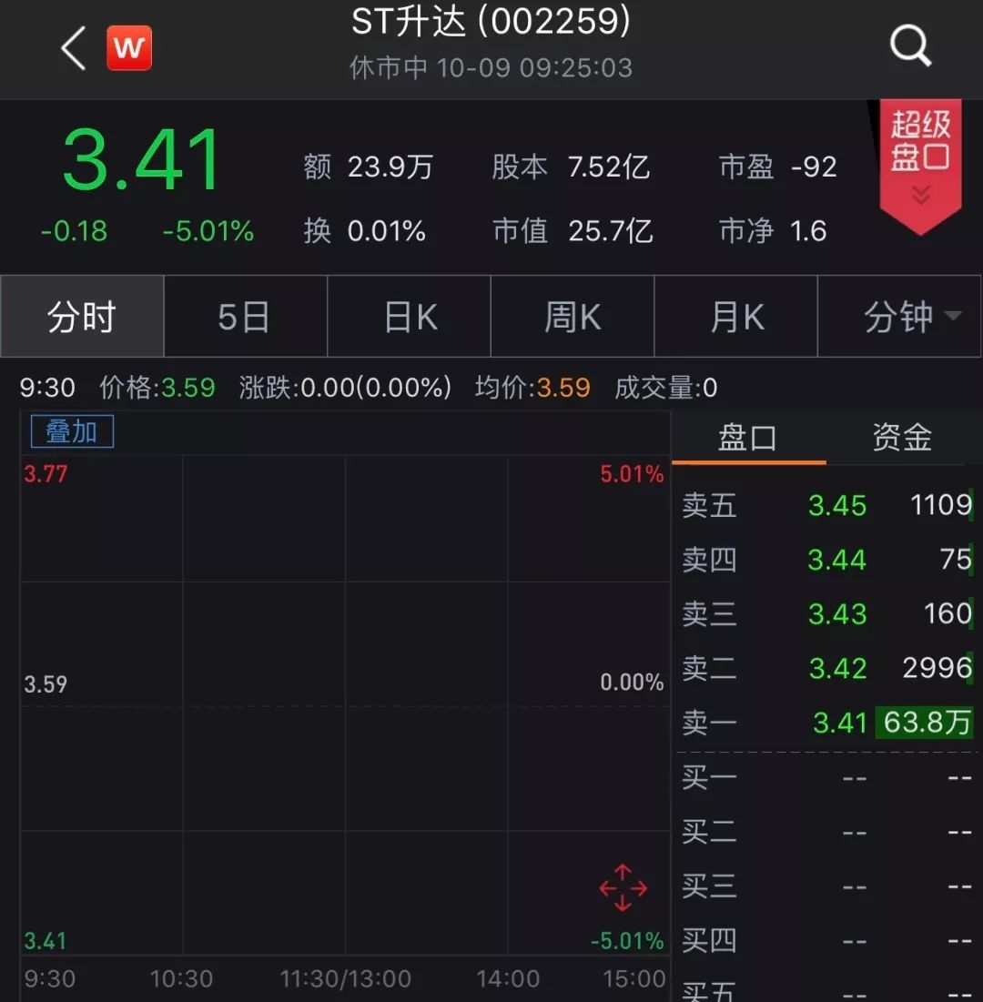 今天复牌,ST升达盘前直接跌停,现报3.41元/股,跌幅5.01%。
