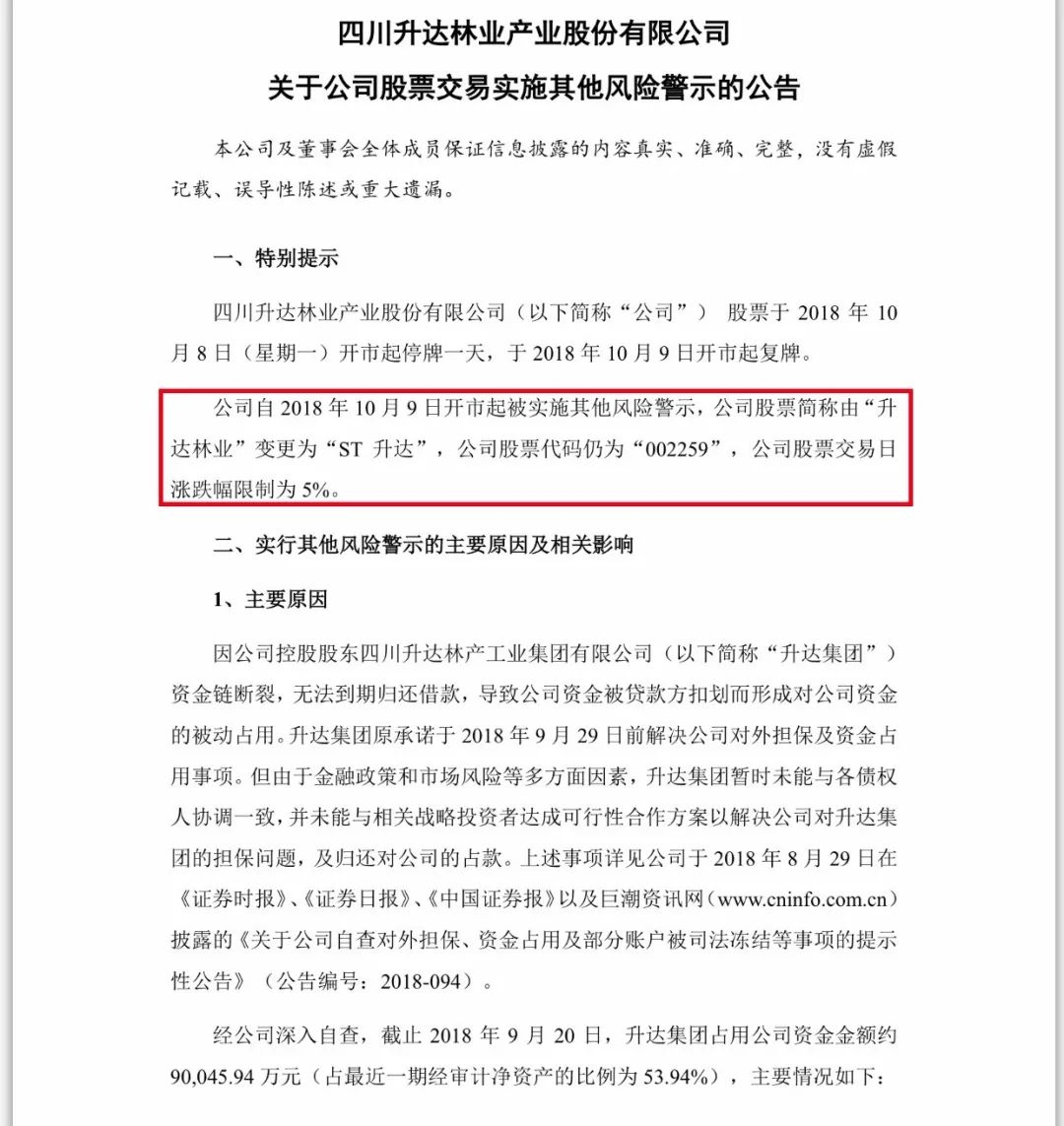巨额资金被升达集团占用,且违规为其提供借款担保,是升达林业此次被ST的主要原因。