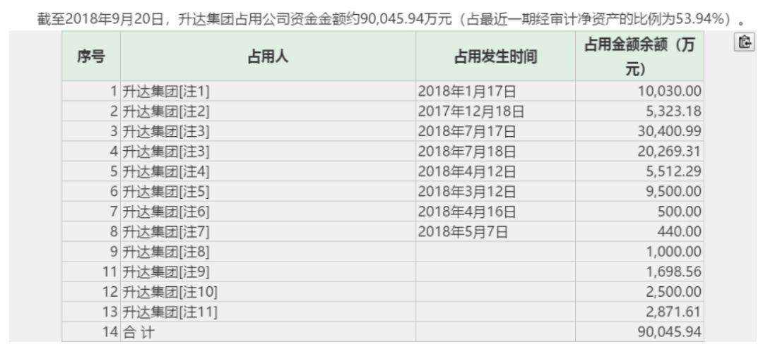 公告显示,截至9月20日,升达林业被控股股东升达集团占用的资金逾9亿元,占最近一期经审计净资产的53.94%。