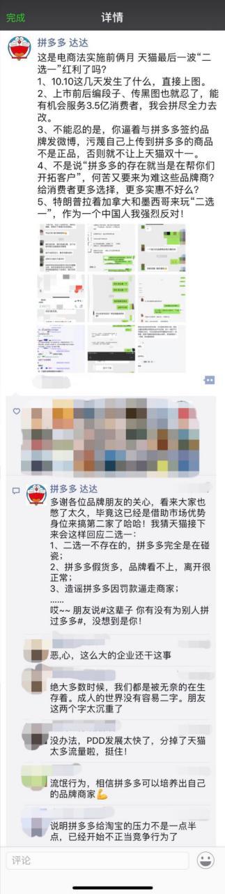 多位拼多多商户近日爆料称遭遇天猫“强制二选一”,这导致拼多多“3周年活动”中的大批品牌商家被迫提出退出活动、下架商品,甚至要求关闭旗舰店。今日,拼多多联合创始人达达在微信朋友圈证实并公布了九张证据截图。