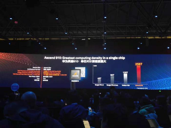 徐直军表示,两款AI芯片都是基于达芬奇架构,昇腾910是目前全球已发布的单芯片计算密度最大的AI芯片,将在明年二季度正式上市。该芯片直接对标英伟达V100和谷歌TPUv3,按照华为的数据,昇腾910的单芯片计算密度可以达到256个T,比英伟达125T高一倍,比谷歌90T的2倍多。