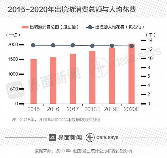 据麦肯锡分析,2017年中国出境游消费总额为16900亿元人民币。预计到2020年,将突破20000亿元人民币。同时,2015年以来,中国出境游人均单次花费基本维持在1.3万元。