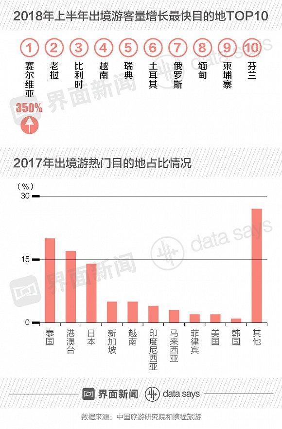 从出境游客流量来看,2018上半年,塞尔维亚为中国出境游客数量增长最快国家,游客量同比增长350%,居于榜单首位。据携程数据,2017年泰国、港澳台和日本为中国出境游最热门城市前三名。
