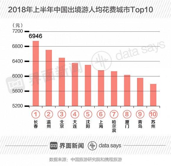 据中国旅游研究院和携程旅游数据,2018上半年长春市出境游人均花费为6946元,居于榜单首位。紧随其后的是温州市和北京市,分别为6704元和6494元。