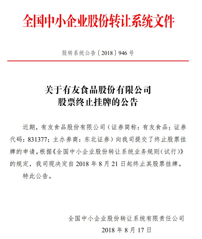作为泡椒凤爪龙头企业,来自重庆的有友食品早在2014年11月就在新三板挂牌。2017年5月,因为“合格投资者数量不足50人”问题,有友食品由新三板创新层降到基础层,今年8月20日,有友食品发布公告称,根据公司战略发展规划,经考虑,有友食品董事会和股东大会审议通过申请终止挂牌的议案,拟向全国股转公司申请终止挂牌。有友食品股票自2018年8月21日起在全国股转系统终止挂牌,毅然进军A股。