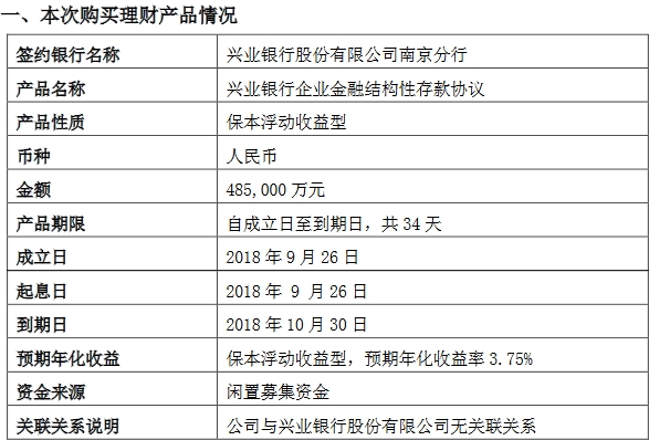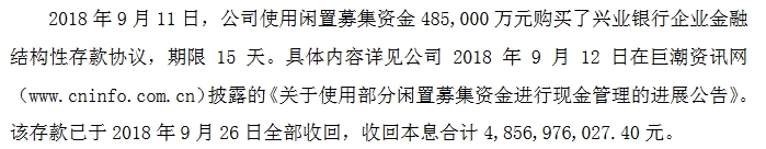 根据公司9月27日最新公告,公司继续使用48.5亿元闲置募集资金进行理财。