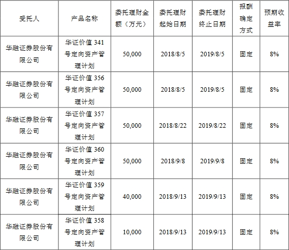 再看最新这一期理财,同样按时间顺序,主要分布在2018年8月5日和22日、9月8日和13日,几乎无缝对接,其中华证价值357号定向资产管理计划(5亿)在8月22日同一天完成交接。