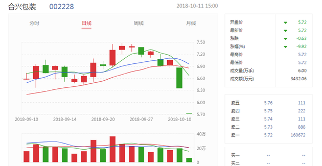 不料,近日合兴包装突然出现大幅补跌。昨天,合兴包装低开低走,开盘仅一分钟后即告跌停,并维持到收盘,全天成交1.25亿元,换手率达1.88%。今天该股更加弱势,一字跌停。