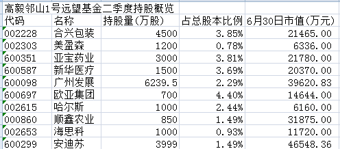 今年高毅邻山1号远望基金持股更加分散,一季度新进了安迪苏、海思科、顺鑫农业,二季度所持个股数量增至十只,其中,除继续增持上述三股,还新进了合兴包装等7股。截至6月30日,总市值达22亿元。