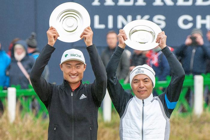英国圣安德鲁斯,2018欧巡赛登喜路林克斯锦标赛决赛轮,李昊桐和“微信之父”张小龙(右)搭档,以-35杆的总成绩赢得职业-业余配对赛冠军。