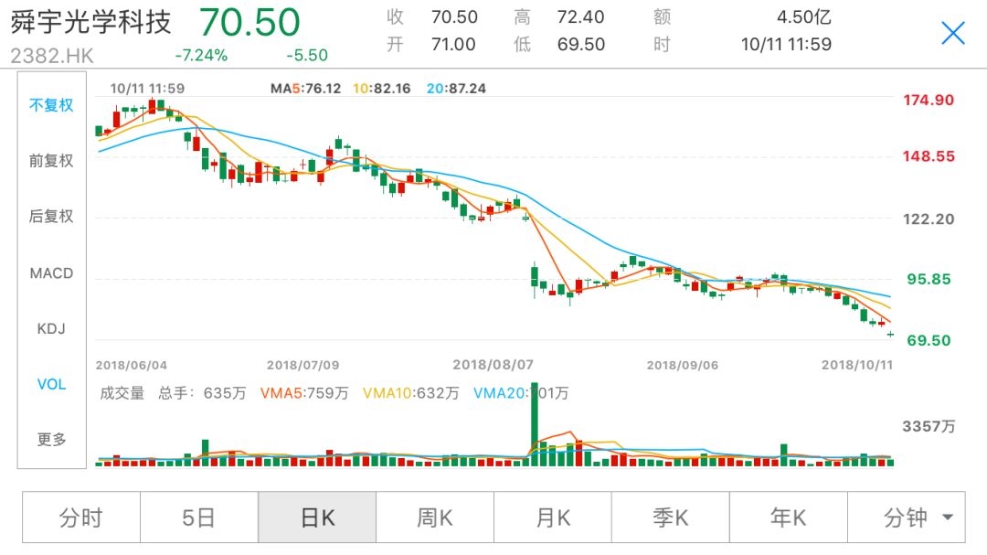 除了互联网公司的回调,其他类别的科技股,也有回调幅度较大的,其中又以苹果概念更甚。比如,舜宇光学科技在今年6月份的股价一度高达174港元多,现价在只有70港元,回撤幅度超过50%。另一只苹果概念回撤幅度也差不多,瑞声科技去年底股价一度超过180港元,最新价也只有70港元左右。