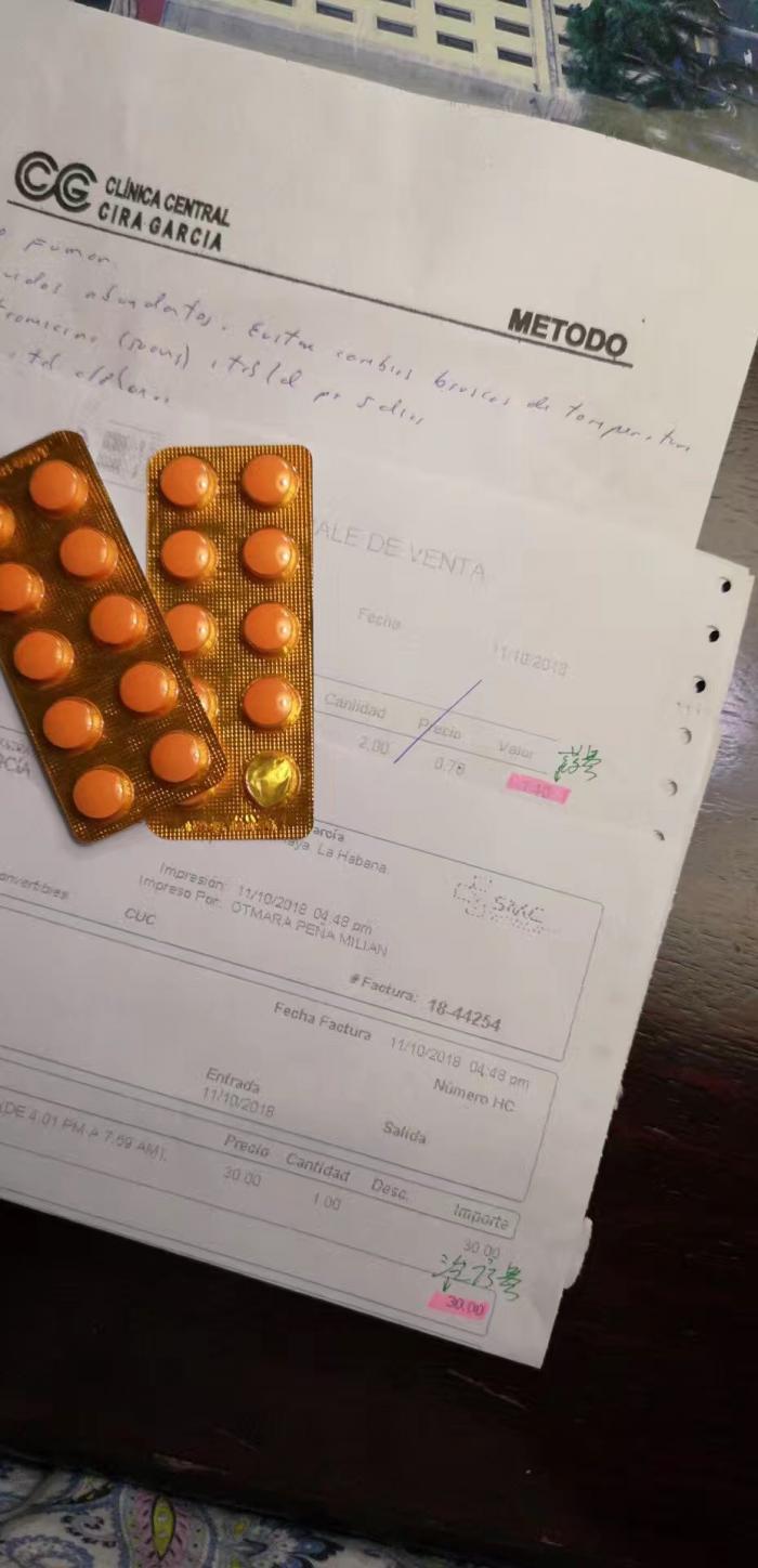 为我看病的是Eduard医生,经过将近半小时的各种询问和检查,他认为我的病是疲劳加上室内外气温忽冷忽热所致,给我开了两板缓解神经痛的药,药费1.4红比索(约合8元人民币),之后我到药房购买此药。