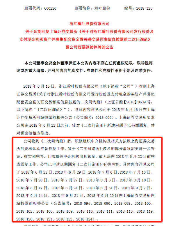 天价收购引发上交所的两度问询,对于第二次问询,瀚叶股份已经多次已申请延期。瀚叶股份称,鉴于《二次问询函》涉及的部分事项需要进一步补充、核实和完善,且需相关中介机构出具意见。