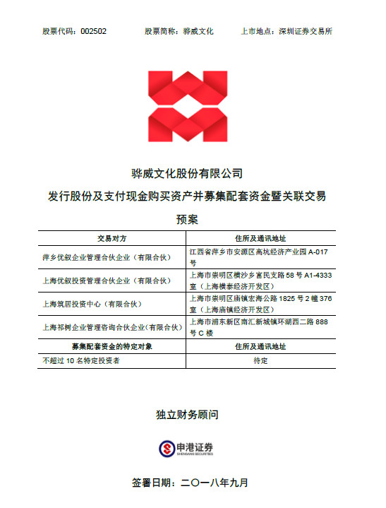 9月28日晚间,停牌逾3个月的骅威文化也凑热闹,公告重组预案,拟以发行股份及支付现金方式,合计作价约15亿元,收购上海优叙等四方持有的旭航网络100%股权,发行股份价格为6.14元/股。同时,公司拟定增募集不超过7亿元配套资金,用于支付现金对价等。