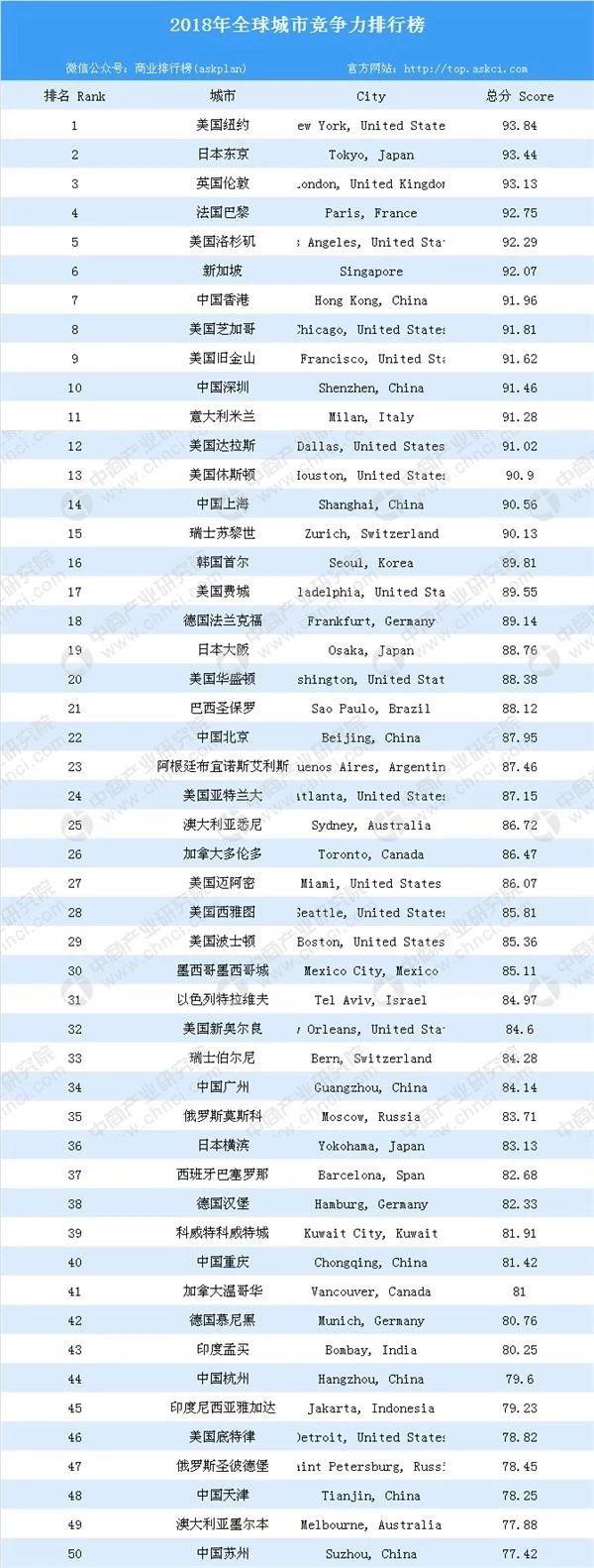 2018全球城市竞争力TOP50:中国9个城市入围(榜单)