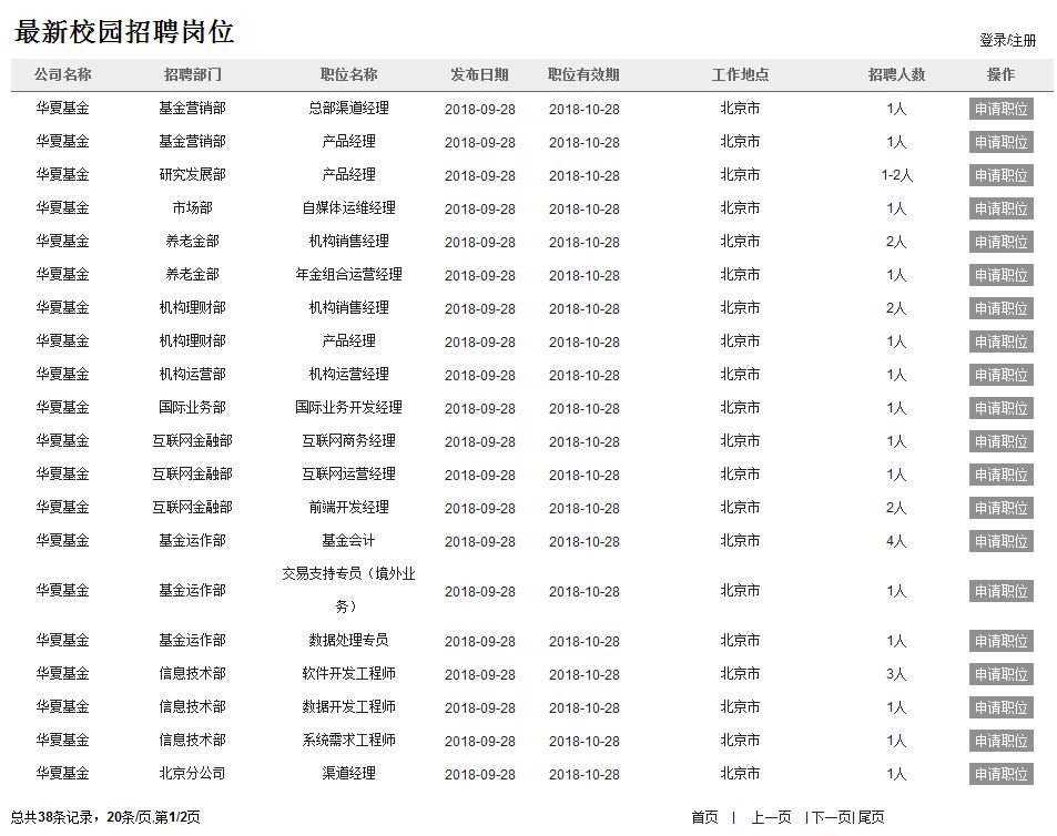 华夏基金在官网发布了校园招聘岗位信息。在营销渠道、中后台等给出了较多岗位,人才需求量很大。