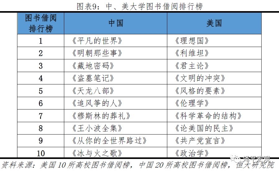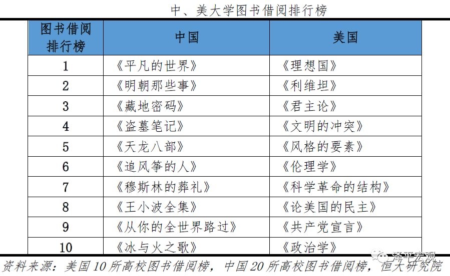 中国学生偏爱故事类书籍,美国学生更喜欢哲学类书籍。中国大学生借阅榜排名前三的图书:《平凡的世界》、《明朝那些事》、《射雕英雄传》;美国大学生借阅图书排名前三的有:柏拉图的《理想国》、塞缪尔·亨廷顿的《文明的冲突》、尼可罗·马基亚维利的《君主论》。