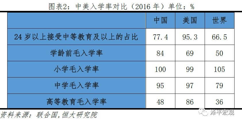 2015年,中国成人识字率为96.36%,美国为97.04%,基本相当;中国学龄前和小学毛入学率分别为84%和100%,高于美国的69%和99%;中国的中学毛入学率为95%,略低于美国;但是中国的高等教育毛入学率为48%,大幅低于美国高等教育毛入学率86%。2016年中国平均受教育年限为9.02年;美国劳动力平均受教育年限为13.68年。