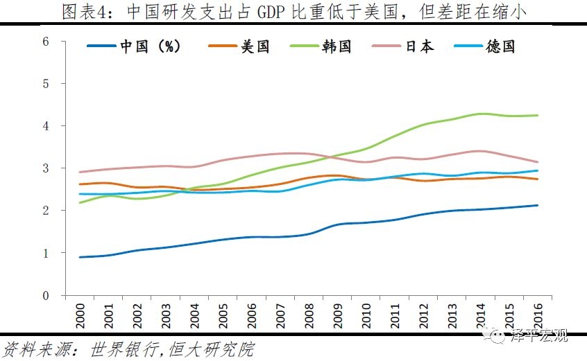 从支出结构看,2015年中国在试验发展阶段研究的投入占比84%,基础研究占比5%,应用研究占比10.8%;美国重视基础研究和应用研究,占比分别为16.9%和19.6%,共36.5%,高于中国的16%,更有利于推进技术创新。