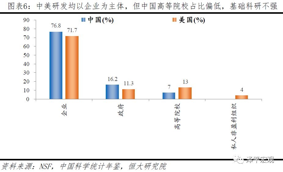 从研发主体看,中美均已形成以企业为主体的研发体系,具备可持续的内在驱动力,但是与美国及其他国家比,高等院校研发占比偏低,为7%,低于美国的13%、日本的12.3%、德国17.3%、法国的20.3%和英国的25.6%。由于基础科研主要在高校,企业主要是应用研究,决定一国长期竞争力的是基础性研究,我国在此方面严重不足,源于科研管理、经费管理和评审制度的缺陷,激励机制不足,亟需推动科研事业单位改革,赋予科研人员知识产权。
