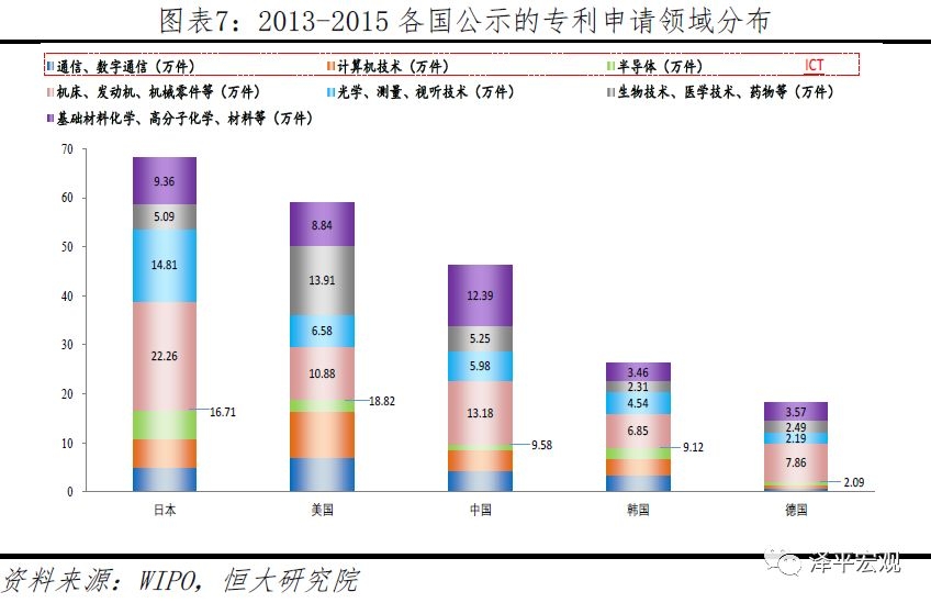 WIPO统计数据显示,2016年中国专利授权量32万,排名第一;美国专利授权28万,排名第三。从专利申请的领域分布看,中国在生物医药技术、半导体、计算机技术方面与美国存在差距。中国在高铁、港口机械、民用无人机、数字安防方面处于全球领先地位;美国在芯片、操作系统两大领域处于全球垄断地位。