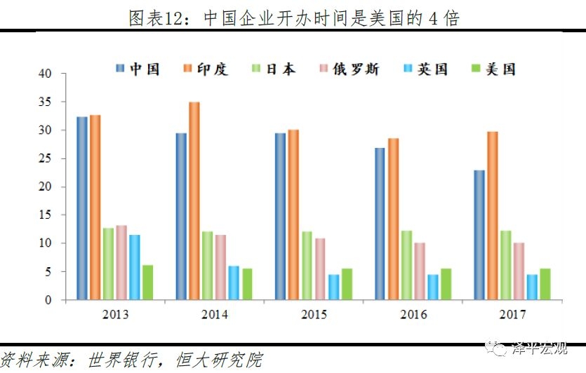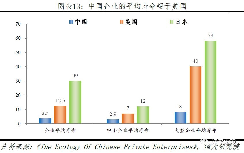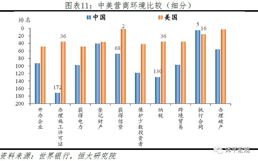 美国的营商环境明显好于中国,美国企业的平均寿命超过中国。世界银行公布的《2018年营商环境报告》显示,中国营商环境世界排名78,美国排在第6位。从各项分项指标来看,中国除在执行合同(5/190)方面好于美国外,其他排名如保护少数投资者(119/190)、纳税(130/190)、跨境贸易(97/190)、开办企业(93/190)排名均靠后,尤其在办理施工许可证以及纳税方面,与美国存在较大差距。中国开办企业时间是美国的4倍,美国大企业平均寿命是中国的5倍。2017年中国企业开办时间为22.9天,美国为5.6天。据美国《财富》杂志,中国大型企业平均寿命是7-8年,小企业的平均寿命是2.9年,平均寿命约3.5年。美国大企业平均寿命不足40年,中小企业平均寿命不足7年,美国企业平均寿命12.5年。