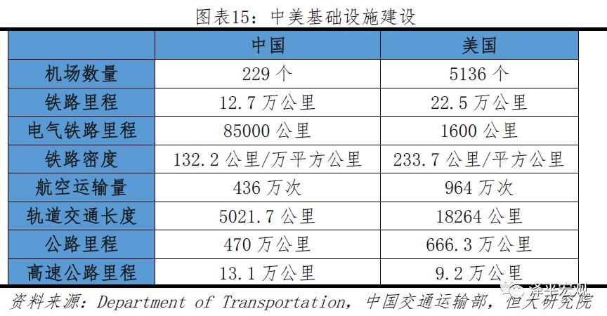 中国基础设施取得巨大发展,但铁路、公路、轨交里程、宽带等信息基础设施与美国比仍有较大差距,分别相当于美国的56%、71%、27%和70%。世界银行发布的“物流绩效指数(LPI)”显示,2016年我国物流发展指数为3.66,低于美国的3.99,物流绩效指数反映出的我国基建水平仍低于美国。2017年中国在224个城市拥有229个机场,铁路总里程12.7万公里,其中高铁总里程2.5万公里(占世界66.3%),电气化铁路里程8.5万公里,铁路密度为132.2公里/万平方公里。美国共计5136个公用机场,铁路总里程22.5万公里,为全球第一,中国铁路里程仅相当于美国的56%;其中电气化铁路里程1600公里,中国的电气化铁路里程是美国的53倍,铁路密度为233.7公里/万平方公里。中国航空运输量及注册运营商全球出港量为436万次,美国为964万次。中国轨道交通运营长度为5021.7公里,美国为18264公里(11349英里),中国相当于美国的27%。中国公路里程为470万公里,其中高速公路为13.1万公里,美国公路里程为666.3公里,其中高速公路为9.2万公里。2016年,中国的每百人中的宽带用户为23人,美国为33人。