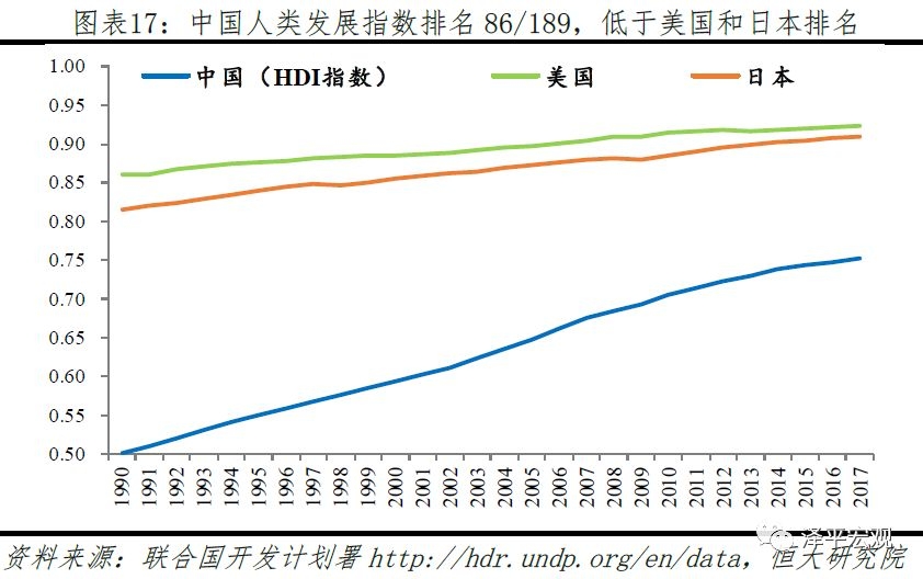 中国人类发展指数上升较快,但仍低于美国,意味着我国居民生活质量仍有较大发展空间。根据联合国开发计划署的数据,2017年中国人类发展指数为0.752,排名世界86/189;美国为0.924,排名世界13/189。