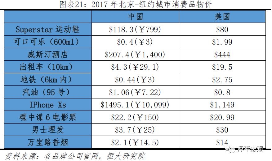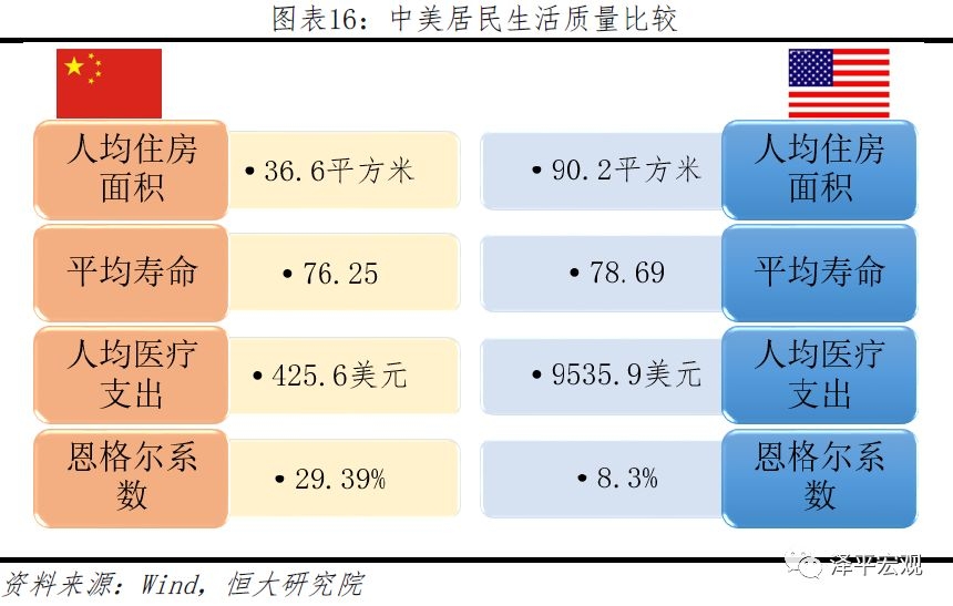 中国贫富差距大于美国,人均可支配收入、人均消费支出、人均医疗开支、人均居住面积等大幅低于美国,恩格尔系数为美国的3.6倍。2016年中国基尼系数为0.465,美国为0.415,贫富差距大于美国。2017年中国人均可支配收入2.6万元,约3849美元;美国人均收入4.5万美元,为中国的11.6倍。2015年中国人均居民最终消费支出2401.7美元;美国人均居民最终消费支出3.6万美元,为中国的15倍。2017年中国居民负债占可支配收入的107.2%,占GDP49%;2017年美国居民负债占可支配收入105%,占GDP的80%。2016年,中国人均住房建筑面积40.8平方米,其中城镇居民36.6平方米;美国人均住房面积为90.2平方米。2016年,中国人均医疗支出425.6美元;美国医疗卫生支出9535.9美元。2016年中国平均寿命为76.25岁;美国为78.69岁。《2017年中国居民消费发展报告》显示,2017年居民恩格尔系数为29.39%;2016年美国恩格尔系数为8.3%。