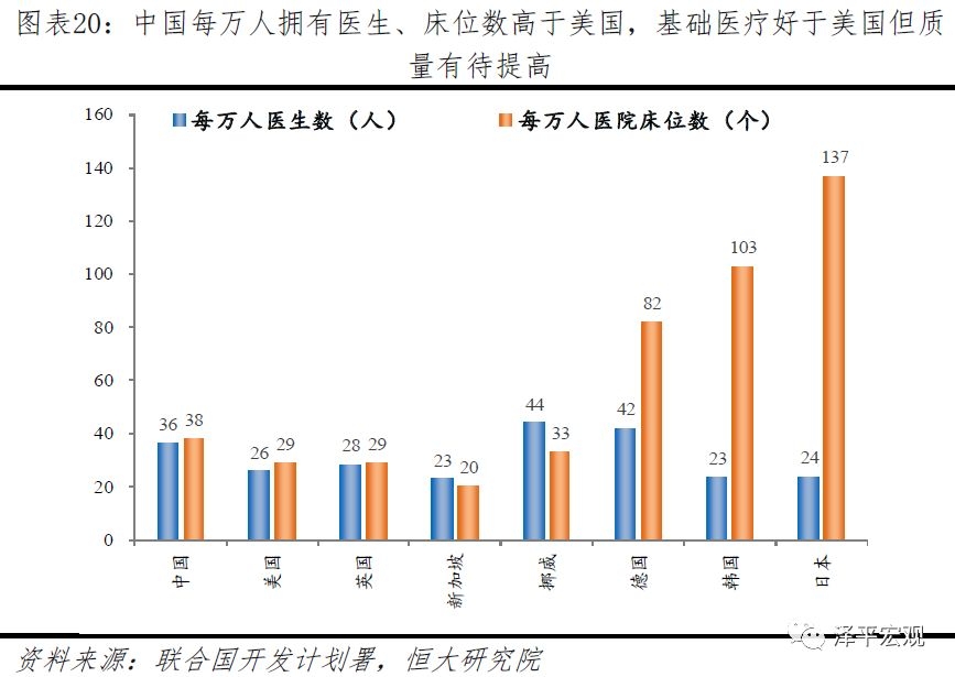 中国每万人拥有的医生和床位数高于美国,基础医疗好于美国,但是由于投入资金有限,医疗质量有待提高。2014年,中国每万人医生数为36.3人,高于美国的25.7人;中国每万人的医院床位数为38个,高于美国的29个。