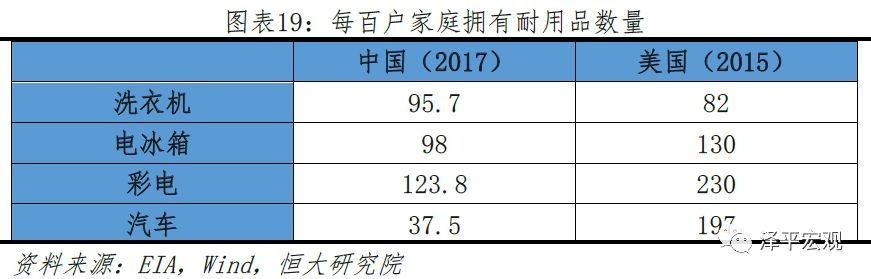 中国每百户家庭拥有的耐用消费品尤其是汽车大幅低于美国,洗衣机除外。2017年,中国每百户家庭拥有洗衣机数量为95.7,电冰箱98,彩色电视机123.8,汽车37.5;美国每百户家庭拥有洗衣机数量为82台,电冰箱130台,彩电230台,汽车197辆。