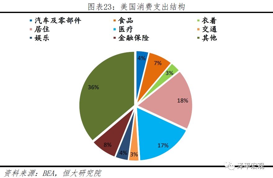 消费支出结构方面,中国居民在必需品方面消费较大,美国服务类消费较大。2017年中国居民食品烟酒支出占比29%,美国为7%;中国医疗支出占比8%,美国医疗支出占比17%;中美居民在居住方面消费均较大,2017年中国居民居住消费占比23%,美国居住消费占比18%。