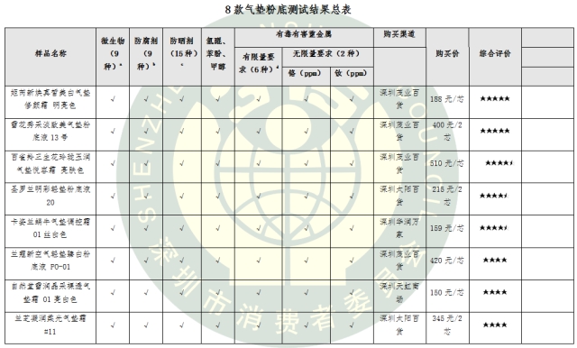 8款气垫粉底所测项目包括微生物、重金属、防腐剂和化学防晒剂等44项指标,不仅符合国家标准要求,且符合欧盟(包含德国)、美国和日本的标准要求,品质安全性达到国际一流标准。