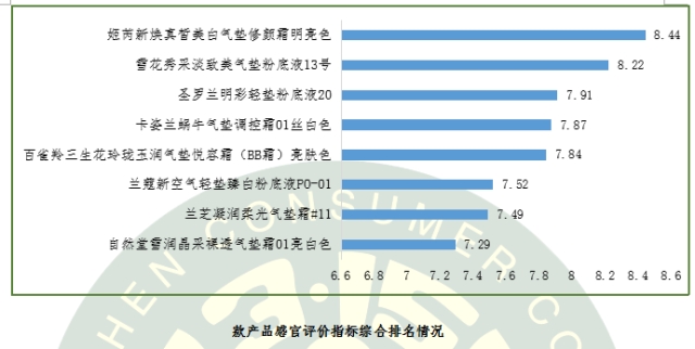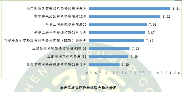 获得本次感官评价指标综合得分前三名的品牌为:姬芮、雪花秀和圣罗兰,得分分别为:8.44、8.22和7.91。8款产品在感官评价中均达到优良水平以上。