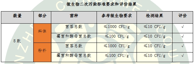 检测结果显示:8款气垫粉底的粉扑和料体的菌落总数、霉菌和酵母菌总数检出量均低于10 CFU/g,远低于产品微生物的标准要求限值,属于安全范围,消费者无需过度担心。