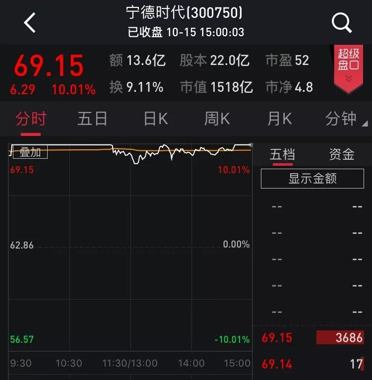 10月15日早盘宁德时代随即封涨停,报69.15元,虽然临近午盘休市时涨停一度打开,最终仍以涨停收盘。