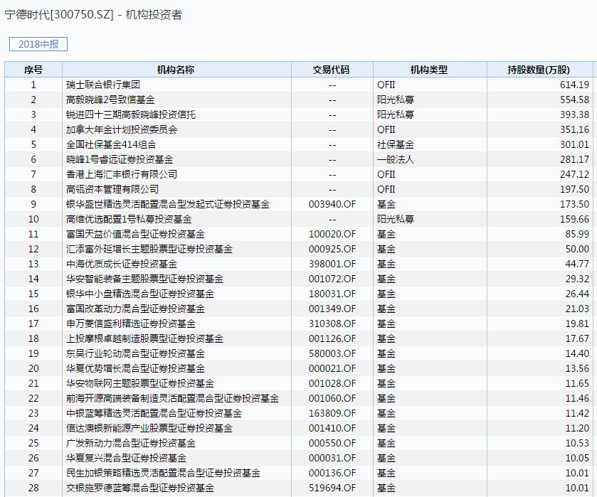 半年报显示,截至今年上半年末,共有28家机构投资者持有10万股以上宁德时代,重仓持有的机构投资者包括公募基金、QDII、私募基金、社保基金等。
