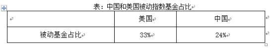 另外,美国共同基金中,被动基金占比较高。而目前中国被动指数基金的占比还不是很高,只有24%。(美国数据来源于ICI《2017 Investment Company Fact Book》整理计算,中国数据与万德资讯数据统计整理加工得到。)