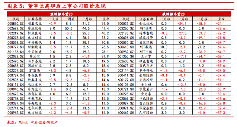 上市公司高管离职,投资者最关心的问题之一是对股价的影响。中泰证券统计了今年以来董事长离职后上市公司的股价表现,50%的上市公司股价在董事长离职后第一日出现下跌,一周后,一月后,至今下跌的占比不断上升。因此,从今年的统计样本来看,董事长的更换对股价提振作用十分有限,更多时候是二者呈现负相关关系。