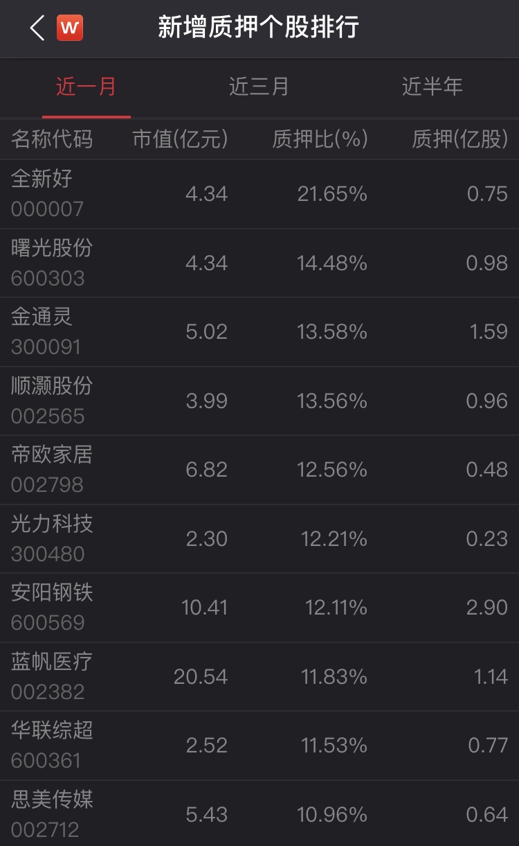 近期,全新好的股权质押比例迅速上升。Wind资讯资料显示,全新好在近一个月新增质押股份排名第一,10月10日公司公告称大股东汉富控股质押0.75亿股,质押股比例为21.65%。