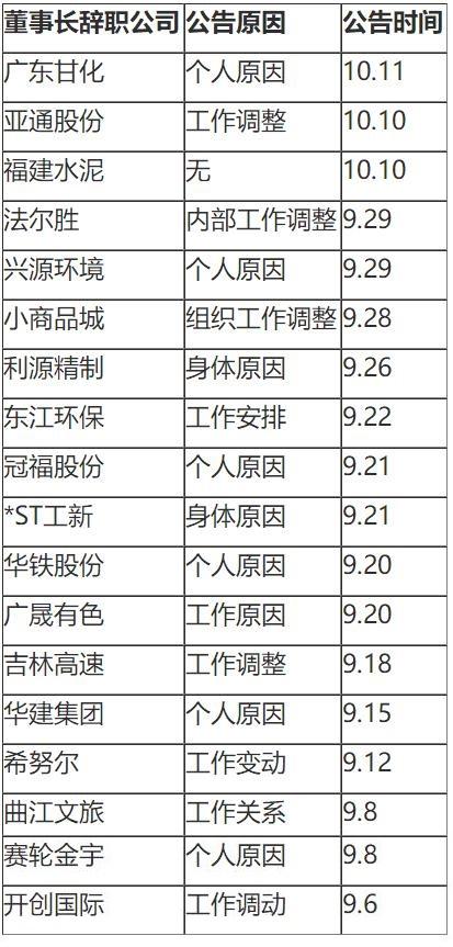 第一财经记者梳理了最近三个月所有董事长辞职的公告发现,公开披露的董事长离职原因主要包括个人原因、工作调整调动以及身体原因,公告内容往往仅寥寥几个字(见附表,第一财经记者整理)。不过,结合各家公司高管离职前后的人事及公司动向,以上简单的官方原因很难说清离职背后的原因和影响。
