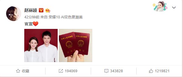 今天一天的工作刚刚开始,娱乐圈就炸出来一个大瓜,总是被路人偶遇但从未承认恋情的赵丽颖和冯绍峰,居然跳过公布恋情的步骤直接官宣结婚了!