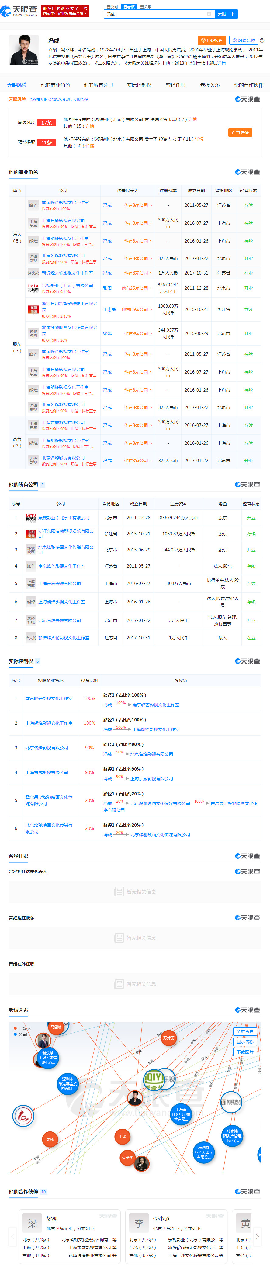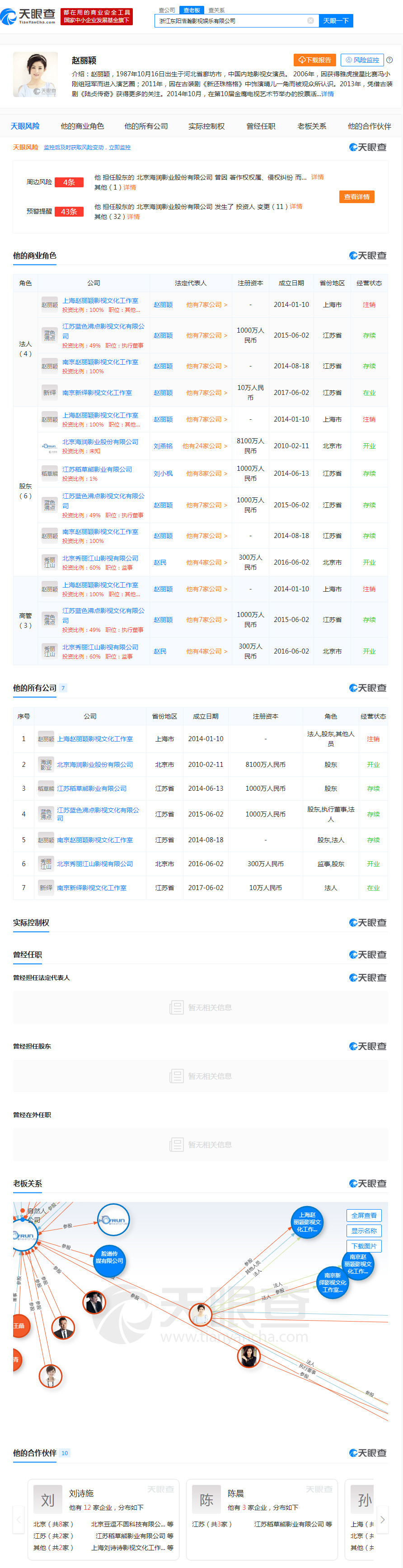 据天眼查数据显示,赵丽颖相关公司有7家,入股了海润影视、稻草熊影业等公司;冯绍峰相关公司有8家,包括乐视影业、东阳浩瀚等公司。算算这些公司的注册成本,已经快要接近10亿了。