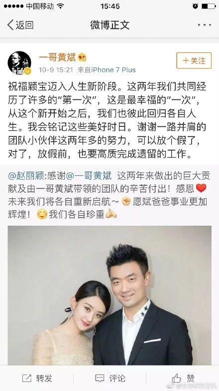 其实从十一长假结束之后,关于赵丽颖和冯绍峰可能结婚的传闻就一直没断过,10月9日就曾有网友爆料两人即将正式公开恋情,不过当天大众只等到赵丽颖宣布挥别合作2年的经纪人,但随即有网友猜测赵丽颖是打算要和冯绍峰共用一个宣传团队。现在回头看赵丽颖前经纪人的微博,“祝福迈入人生新阶段”,感觉网友的推断其实很有道理呀~
