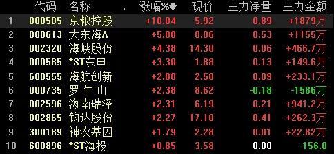 此外,海南自贸区概念股昨日盘中亦走强,京粮控股强势涨停,海峡股份、罗牛山等多只个股走势强劲。