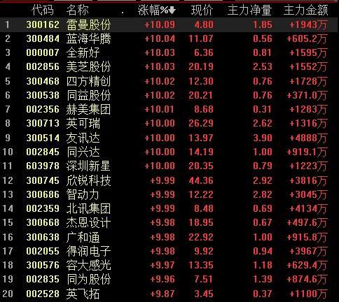 截至收盘,深圳板块中包括雷曼股份、全新好、美芝股份、四方精创、同益股份、赫美集团、英可瑞、北讯集团等近20个股集体涨停。