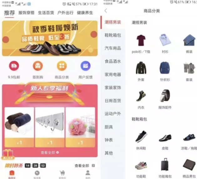 10月15日,每日经济新闻记者下载并试用“值点”App。在推荐页面,“9.9包邮”、“低至3折”、“新人专享福利(1元)”等字样惹人注意。“商品分类”入口下,则具体包含潮搭男装、鞋靴箱包、汽车用品等11个品类。