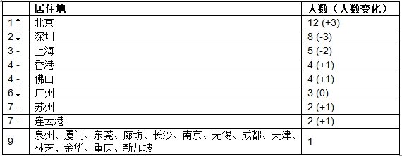 北京取代深圳成为中国女企业家的居住地首选,比去年增加3位,有12位;深圳比去年少3位,以8位排名第二;上海减少2位,以5位排名第三。有5位女企业家住在大陆以外:4位在香港,1位在新加坡。