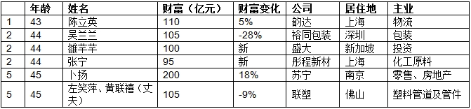 四分之一新人,比去年增加4位,有13位。其中,12位都是白手起家的。领衔的是世界500强企业恒力的范红卫,二十多年前和她先生陈建华一起进入化纤行业,今年首次以财富375亿元位列女企业家榜第五名;其次是磁性材料元件制造商领益智造的曾芳勤,财富160亿元进入榜单前25名;再次是恒瑞医药的吴羽岚,财富150亿元进入榜单前30名。得益于海底捞上市,两位“火锅女王”舒萍和李海燕分别以财富125亿元新上榜。胡润表示:“意外的是,新人中,没有一人是从事新产业的。”