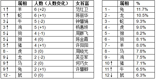 今年属羊的女企业家进步最大,增加2人,以6人排到第一;蛇也表现不错,增加1人,以6人并列第一。